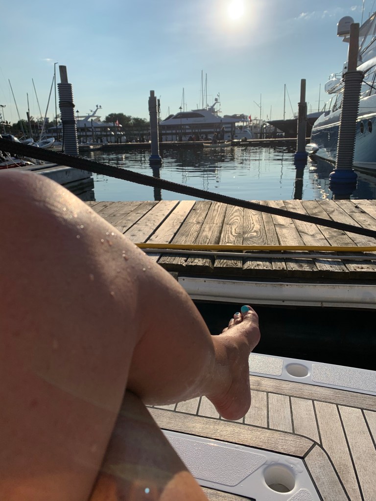 In talking to other Captains and crew, I’ve been told that the dew does NOT need to be dried off so early in the morning. If you get it by 10am the sun isn’t hot enough to dry the spots so you’ll be fine. I’ve been playing around with that a bit. So today I slept in til 6:30, I showered BEFORE work and even put a little makeup on. We were going to take a movie star we met at a restaurant out today so I wanted to be presentable. Did my morning chores. Boss went to play tennis…